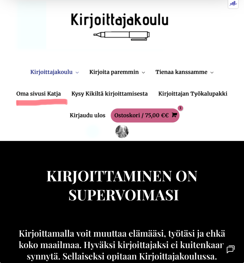 Kun olet kirjautunut sisään Kirjoittajakouluun, löydät Oma Sivusi-osion ylänavigaatiosta. Siellä on tiedot sinusta, tilauksistasi sekä kursseista ja valmennuksista, joihin olet ilmoittautunut. Omalta sivultasi pääset myös näkemään omat tietosi, liittymään affiliate-kumppaniksemme ja julkaisemaan kirja- ja elokuva-arvosteluja.