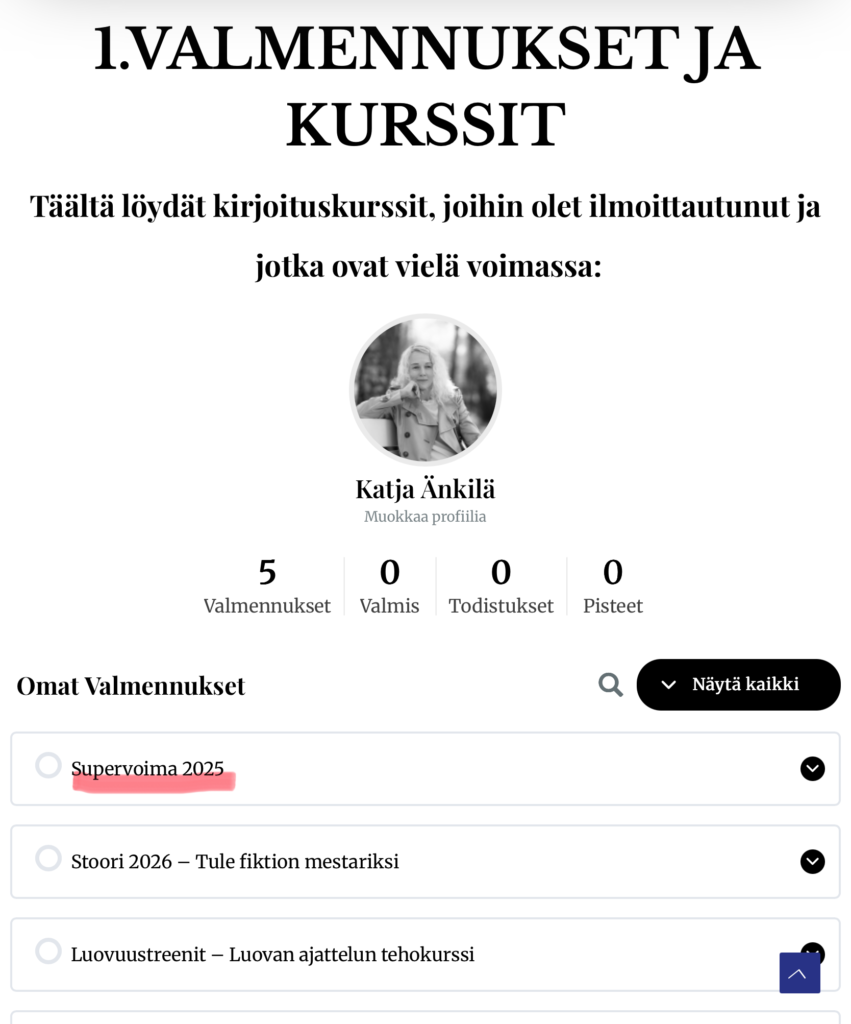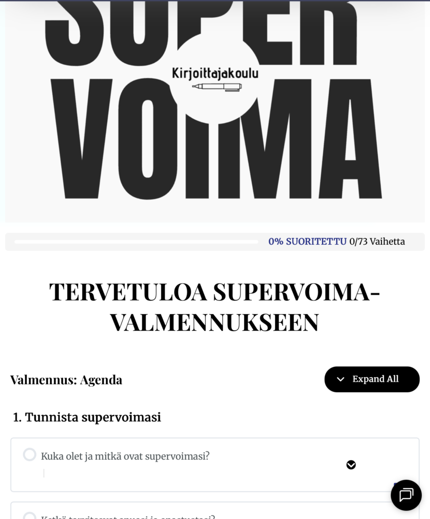 Voit palata aina valmennuksessasi ja kurssissasi taaksepäin, jos haluat. Voit myös koska tahansa kysyä neuvoa ja apua meiltä tai virtuaalivalmentajaltamme Kikiltä. Muista myös Kirjoittajan Työkalupakki, josta löydä joukon digioppaita, videoita ja työpohjia eri kirjoittamisen lajeista.
