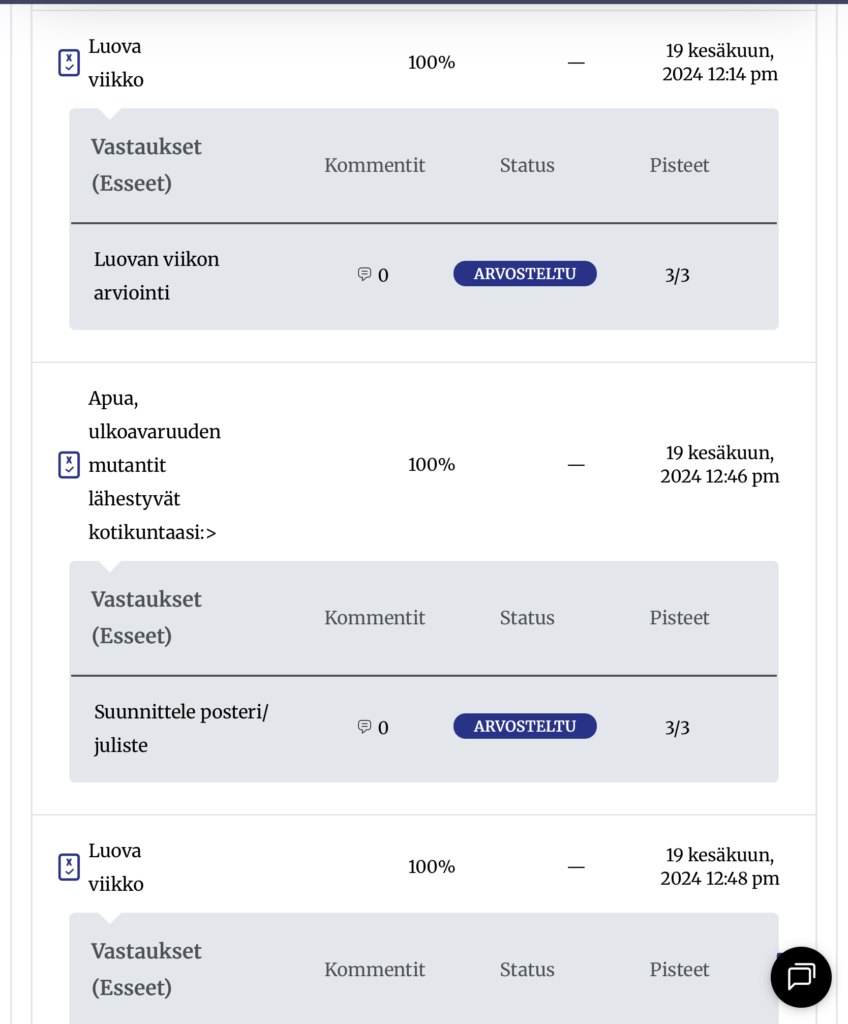 Valmennuksissa on tehtäviä, joista osa tarkastetaan automaattisesti, osasta saat henkilökohtaisen palautteen. Pääset katsomaaan lähettämiäsi tehtäviä ja lukemaan saamasi palautteen Omalta sivultasi valmennuksesi aktiiviisuuspaneelista. Saat sen näkyviin puhekuplaa klikkaamalla.